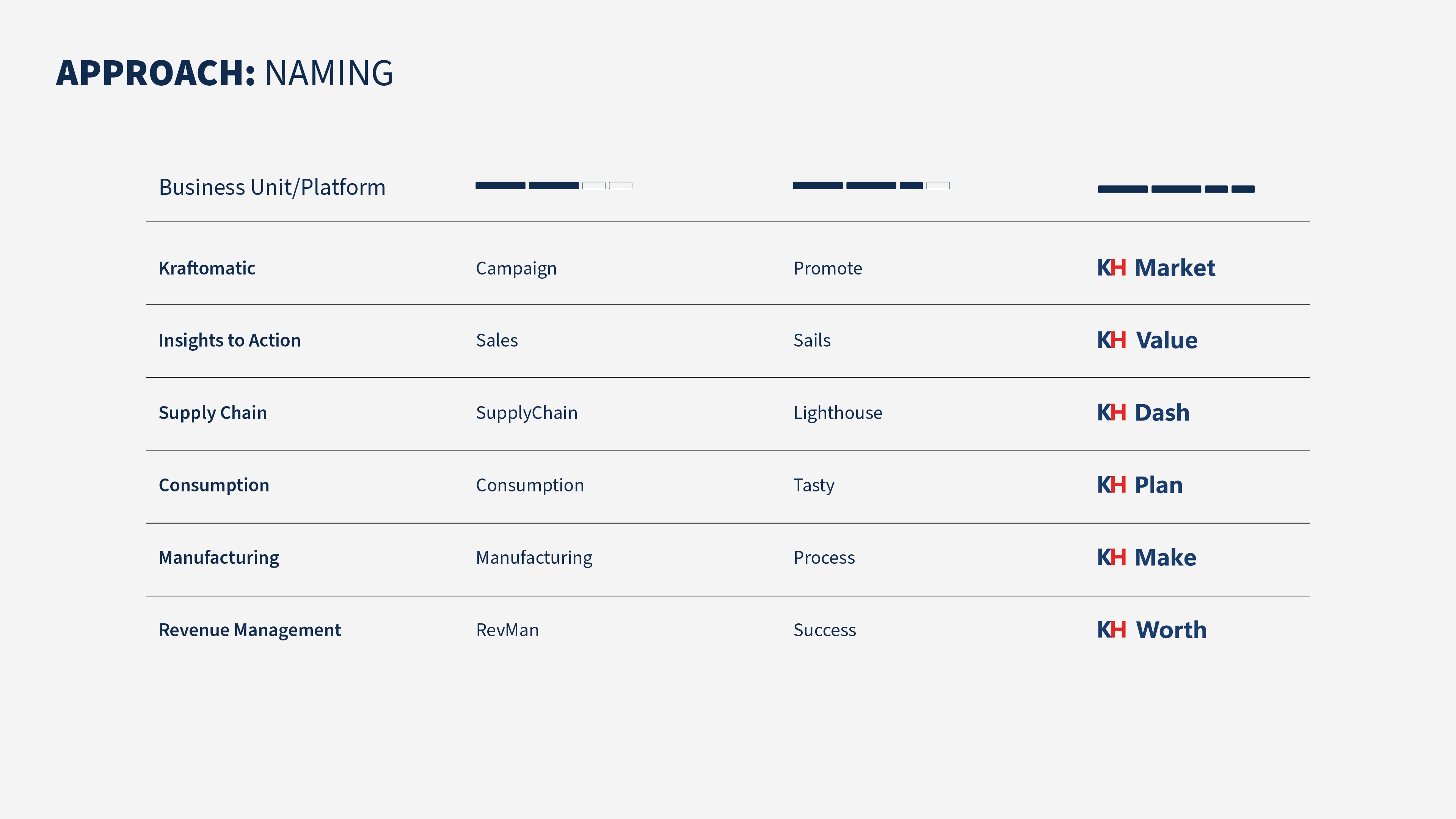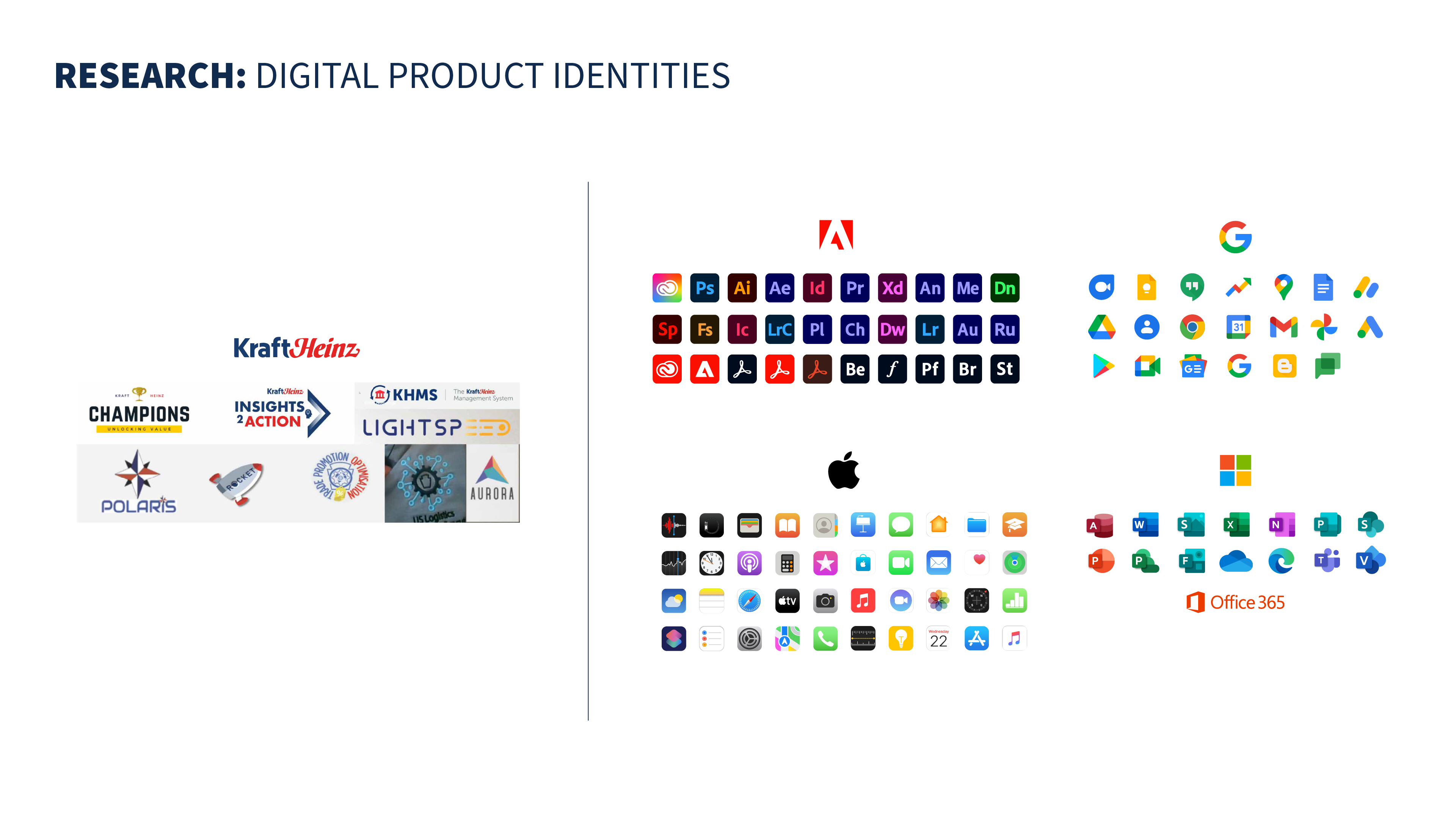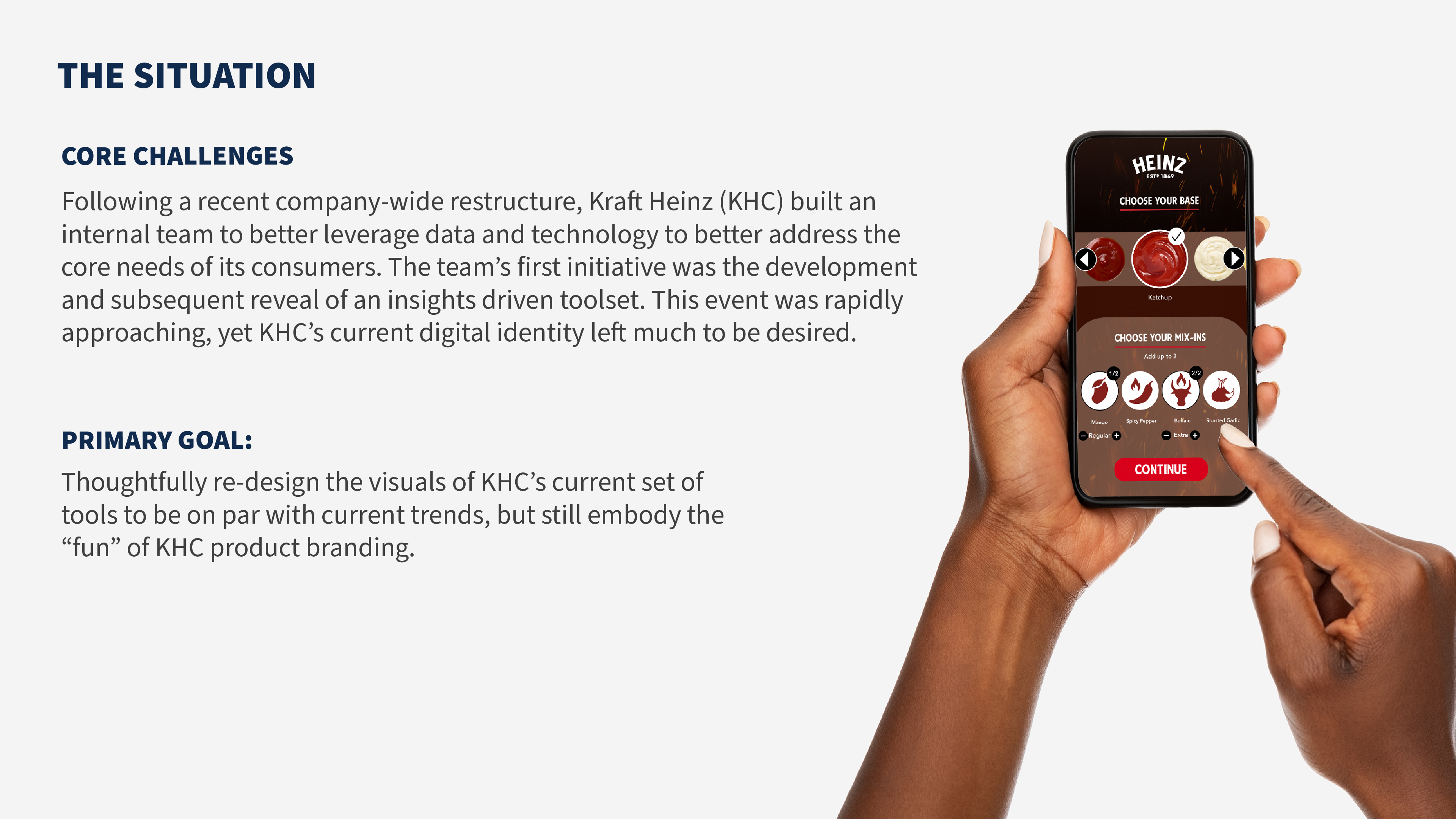 The overall thought process was: How do we "fill the gaps" KraftHeinz is experiencing to complete the picture? With that in mind, the new designs were built from the concept of Tangram Puzzles. Knowing we have the necessary resources, let's leverage the basic shapes extracted from the whitespace within KH to build a minimal, yet fun icon set that's consistent with the brand. The color choices were chosen as variants of the existing identity to impart a more "delicious" look and feel.